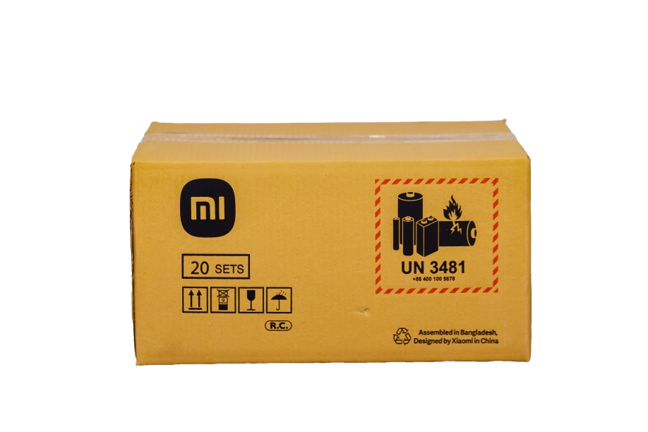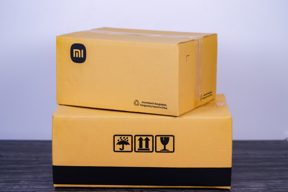 Corrugated cardboard in brown kraft color with high-contrast black and red printing.